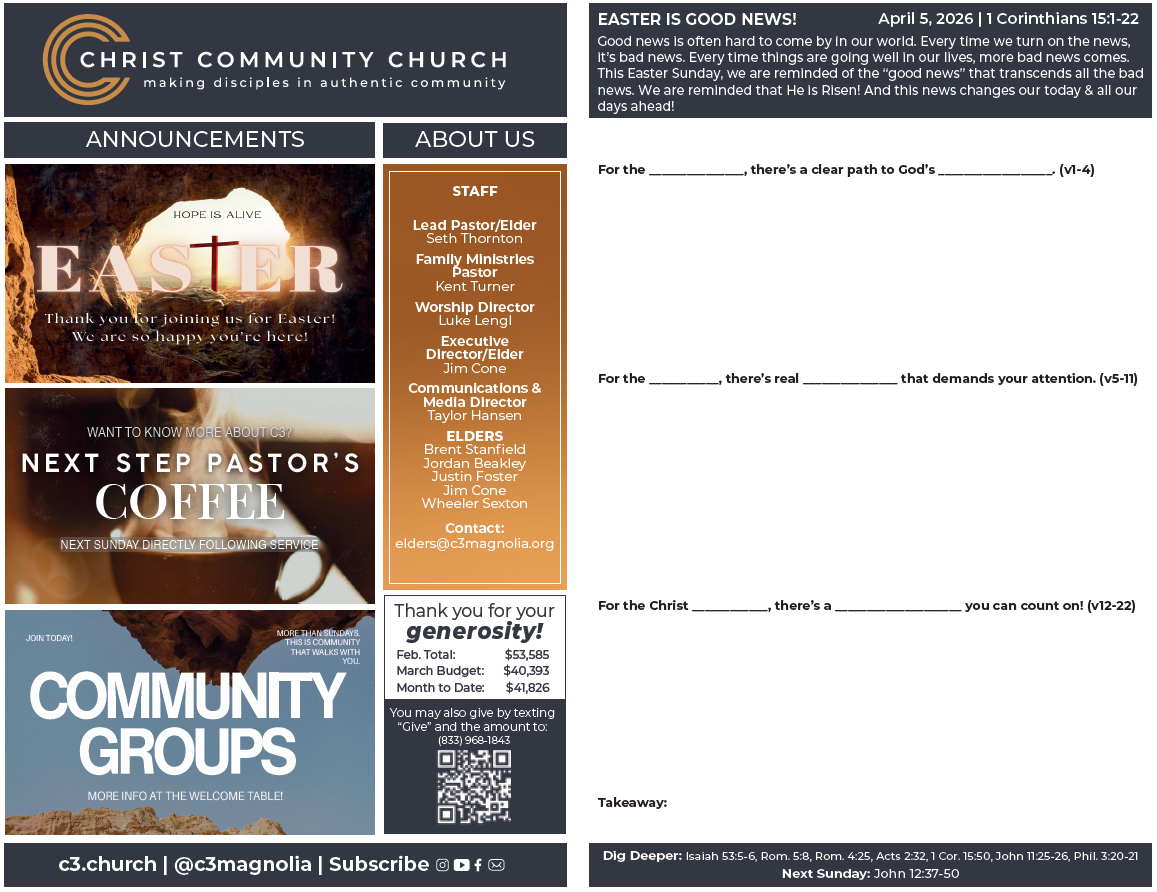 Play VideoPlay Video https://www.c3.church/wp-content/uploads/Sermon-Audio-2026.04.05.mp3 Seth Thornton Sermon Date: April 5, 2026 Related Passages: 1 Corinthians 15:1-22 Sermon Notes Come Visit Us! Come Visit Us! Sermon Notes